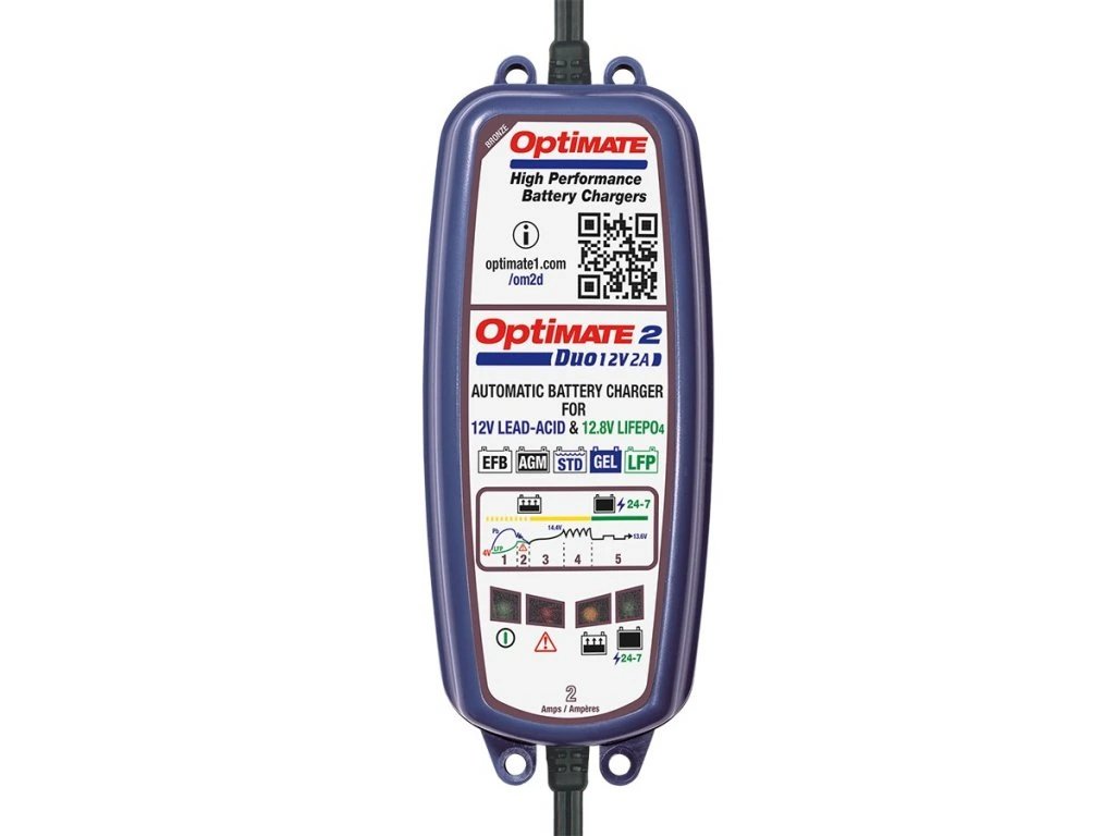 OPTIMATE 2 DUO (12V/2A) TM550 je automatická nabíječka. Výrobcem je firma TECMATE, dovozcem je firma MICRONIX, spol. s r.o. Nabíječka slouží pro nabíjení klasických olověných, olověných bezúdržbových, AGM, gelových i lithiových (LiFePO4) akumulátorů.