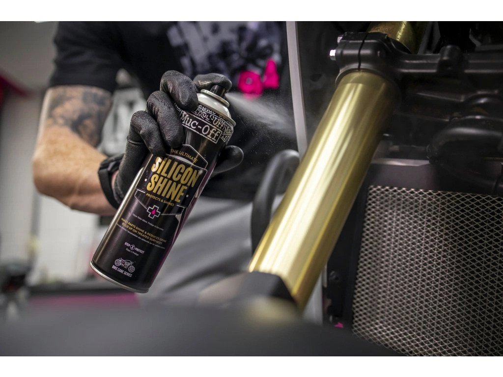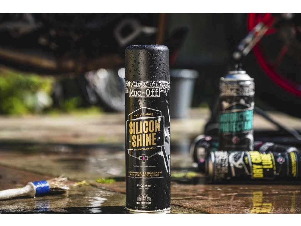 MUC-OFF SILICON SHINE zanechává blyštivý povrch na kovech, gumě a plastech. Nerozežírá ani nezměkčuje gumové a plastové díly, jako to dělají některé jiné hydrokarbonové spreje. Navíc jeho pravidelné používání pomáhá prodloužit životnost ošetřovaný komponentů!