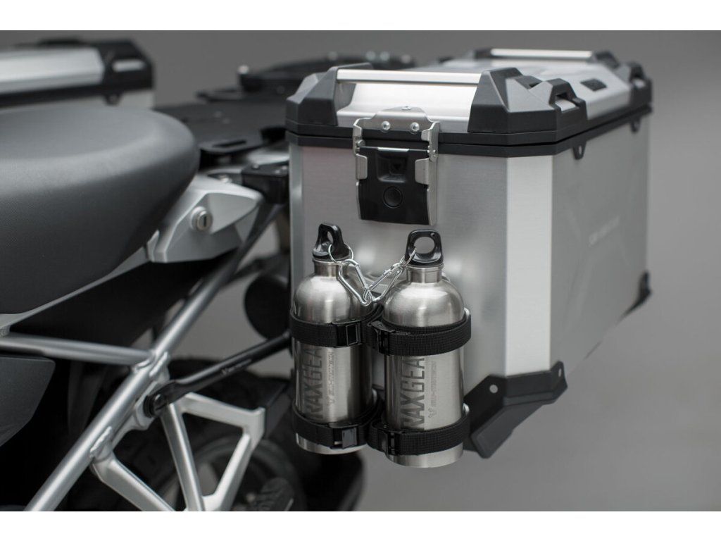 Připraveni na další dobrodružství: Na hliníkovém kufru TRAX můžete bezpečně přepravovat další tekutiny, jako je voda nebo benzín, a jste dobře vybaveni pro cesty mimo vyšlapané cesty. Ke dvěma lahvím se dostanete několika jednoduchými pohyby. Tato sada lahví TRAX se připevňuje k držáku příslušenství TRAX na bočních kufrech TRAX. Držák příslušenství je nutné objednat před montáží.